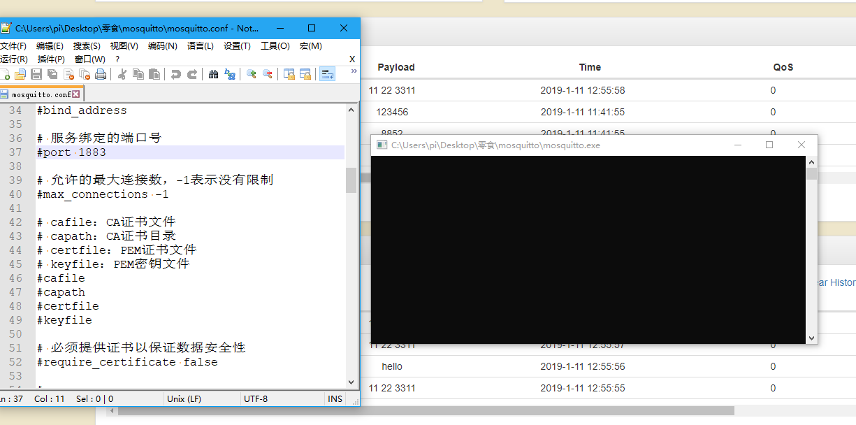 如果不想使用网络的 MQTT 服务器,则你可以使用一下本地 mosquitto Windows 服务器环境包,解压直接运行 mosquitto.exe 即可,其中配置文件是 mosquitto.conf。