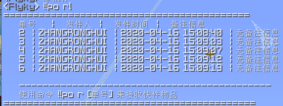 !!po显示帮助信息!!po p [收件人id] [备注]将副手物品发送给[收件人],[备注]为可选项!!po rl列出收件列表。包括[发件人],[寄件时间],[备注消息]和[单号]!!po r [单号]确认收取该单号的物品到副手(收取前将副手清空)!!po pl列出发件(待收取)列表,包括[收件人],[寄件时间],[备注消息]和[单号]!!po c [单号]取消传送物品(收件人还未收件前),该单号物品退回到副手(取消前将副手清空)!!po ls players查看可被寄送的注册玩家列表!!po ls orders查看当前中转站内所有订单 [helper以上权限可用]!!po player add [玩家id]手动注册玩家到可寄送玩家列表 [admin以上权限可用]!!po player remove [玩家id]删除某注册的玩家 [admin以上权限可用]