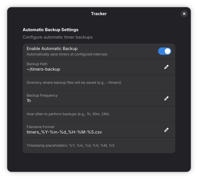 - Automatic backup: automatically export timers to CSV at configurable intervals