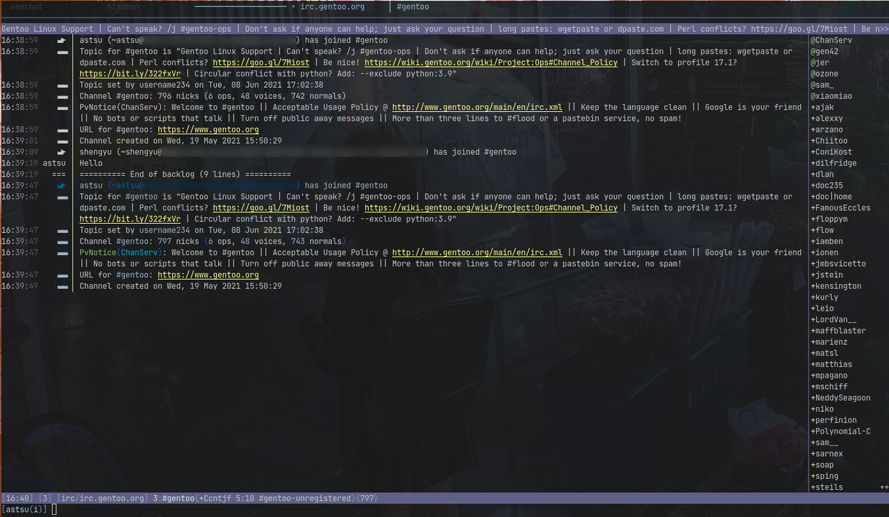 Weechat has a lot of tweaks in its configuration provided in these dotfiles. Some plugins (called scripts) are also deployed but they also lead to potentially two issues: