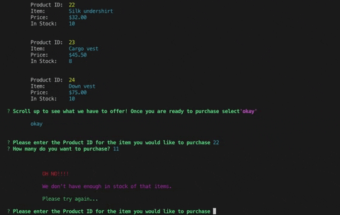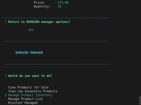 It will then ask you if you want to buy something else! If you select an item and an amount that is in stock, BAMAZON will calculate a total price for you and update the inventory on the SQL database!