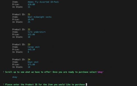 Bamazon is a shopping prototype CLI app that uses a SQL database to track orders, update inventories, and determines trending products