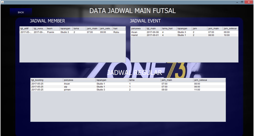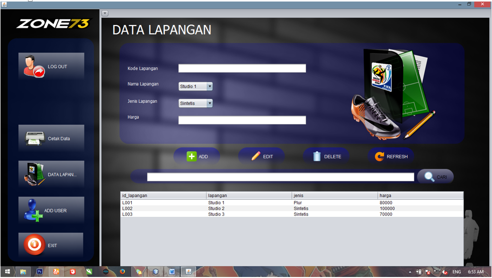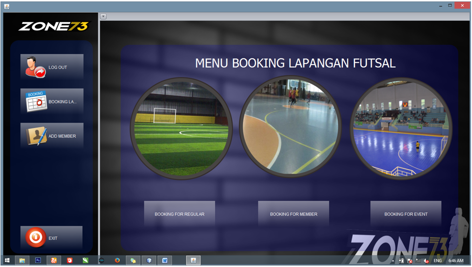Tampilan Pertama Aplikasi Desktop Lapangan Futsal Zone73
