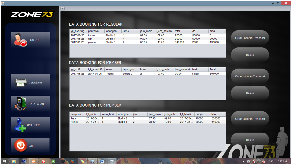 Aplikasi ini merupakan project lama saya dalam membuat sebuah sistem penyewaan lapangan futsal Zone73 daerah cibiru dengan menggunakan bahasa pemrograman Java Old my project, App base on desktop java netbeans. #System Requrement
