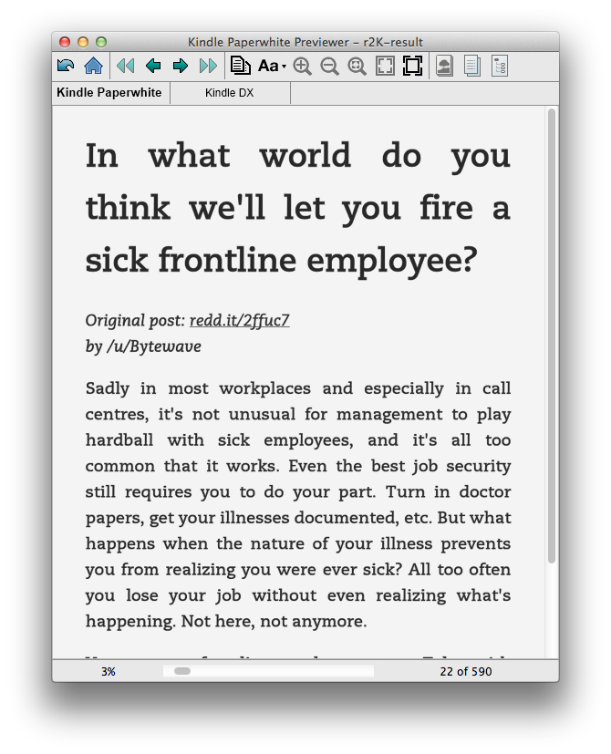 Now you can read long text posts from /r/talesfromtechsupport, /r/nosleep, /r/tifu or a story-based subreddit of your choice with the comfort of your e-reader. Here's an example of what the auto-generated books look like: