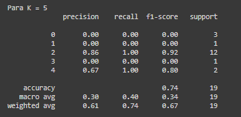 Entretanto o relatório de classificação apresenta um resultado importante para o modelo, os dados estão fortemente agrupados (support = 12) em uma única classe (2), retornando 0 para as outras métricas e classes. Um dos fatores para isso acontecer é baixa quantidade de dados no dataset.