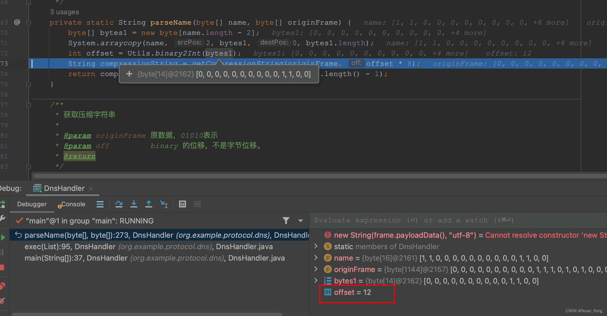 cname解析也同上,这里框1表示读取后续5位。框二同理。框三有点不同,但是可以看到第7~8位为1。说明与后续1字节组成偏移量。这里偏移量对应的是com。当读取偏移量后,也是根据读取字节为0结尾。